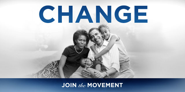 Obama säger ”Yes we can”, ”Change we can believe in” och ”Change we need”.