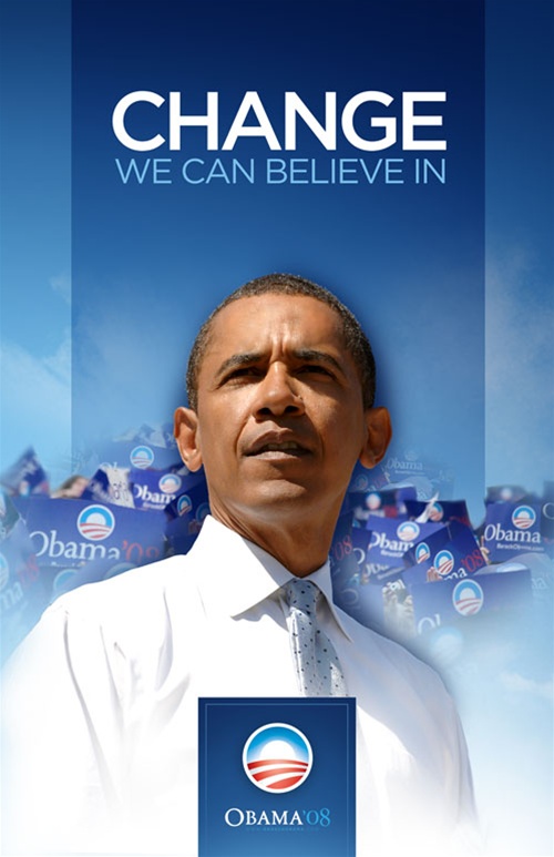 Obama säger ”Yes we can”, ”Change we can believe in” och ”Change we need”.